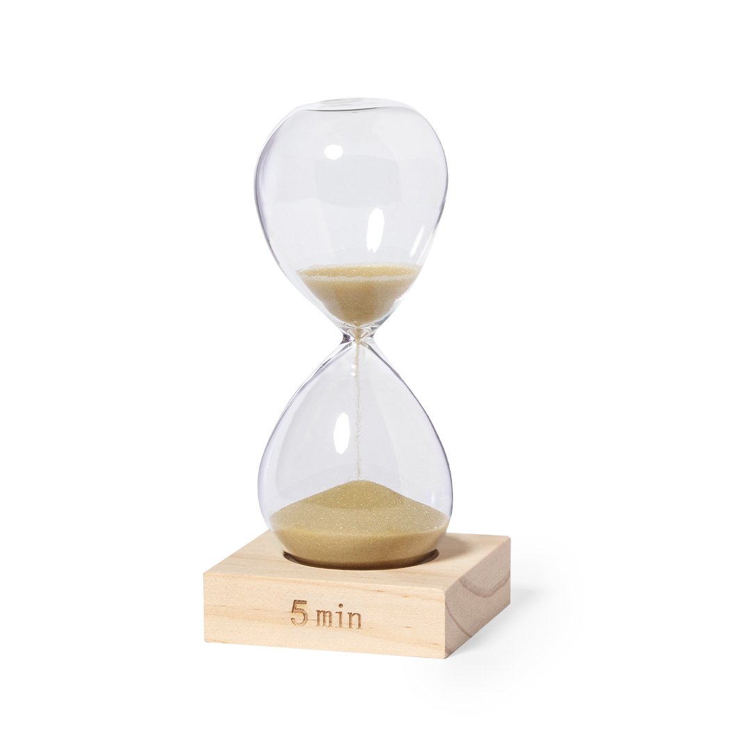 Reloj de arena de 5 minutos de duración. Fabricado en cristal de borosilicato, que ofrece una resistencia y durabilidad excepcionales, con base en madera de pino natural. Su elegante diseño y la arena en color natural lo convierten en un gadget decorativo y funcional, ideal para medir el tiempo. Presentado en una caja individual de diseño kraft.