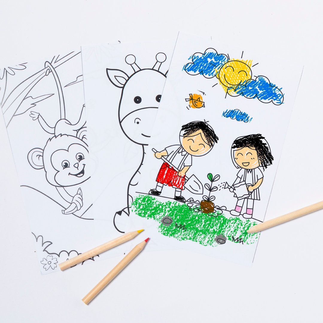 Set para colorear hecho en cartón reciclado. Divertido conjunto de dibujos y lápices de colores en una práctica carpeta con asas. Incluye:Bloc de 20 hojas con dibujos de naturaleza para colorear.Caja con 6 lápices de madera con minas en multitud de colores.Sacapuntas.Goma de borrar.