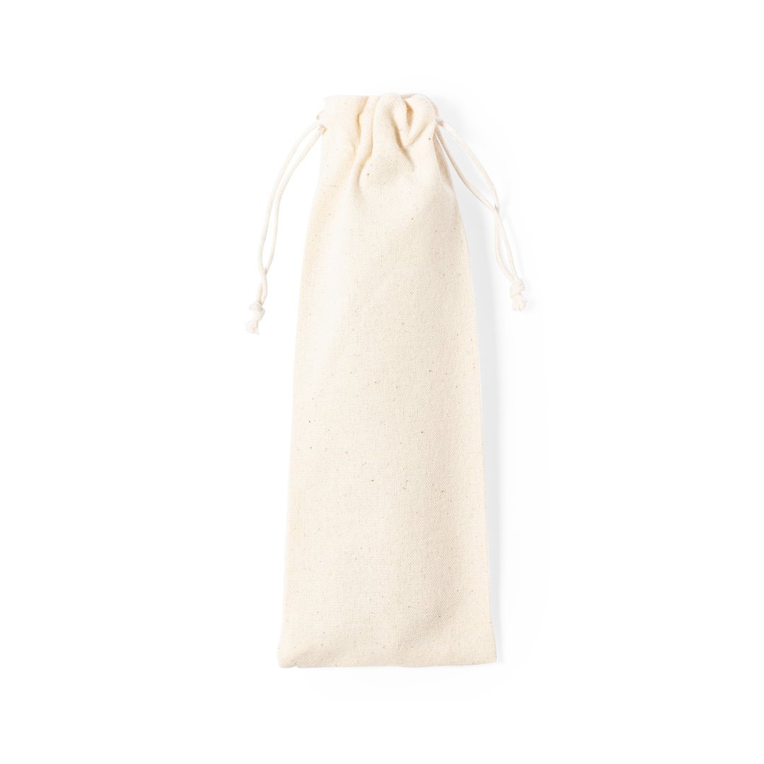 Set de cubiertos de 5 piezas fabricados en acero inox, con mango en madera natural. Incluye cuchara, tenedor, cuchillo, pajita reutilizable y cepillo limpiador para la pajita. Presentación en funda de algodón natural con cordón de cierre.