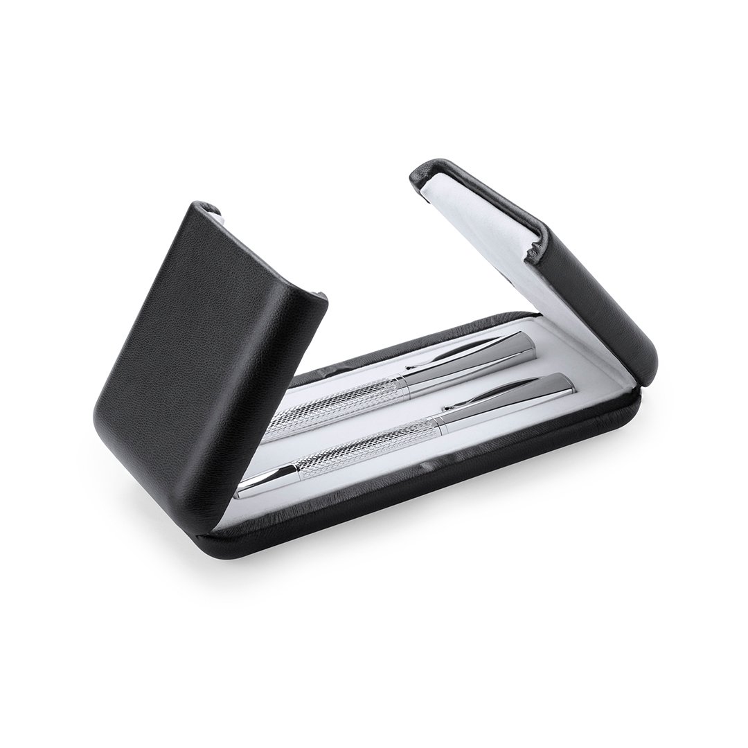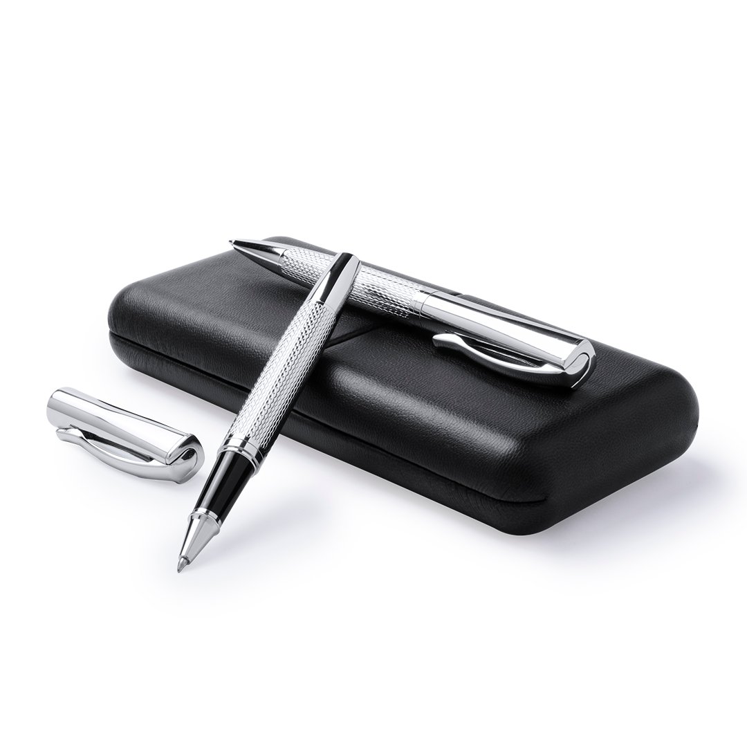Elegante set de bolígrafo de mecanismo giratorio y roller de capucha en sobrio diseño. De cuerpo metálico antideslizante en acabado plateado brillante con clip a juego. Presentado en elegante y original estuche individual de polipiel en color negro con interior troquelado en suave antelina blanca. De cartucho jumbo con tinta azul de calidad alemana.