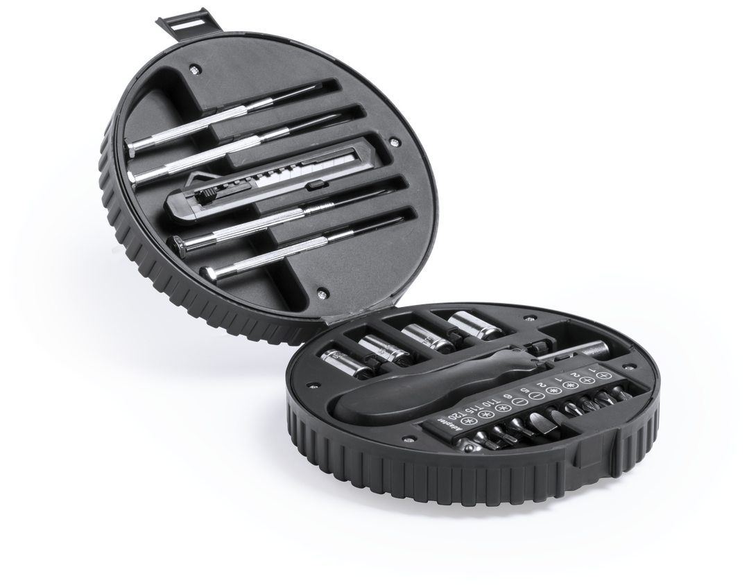 Set de herramientas de 20 accesorios en resistente estuche con diseño de rueda. Incluye set de destornilladores de precisión, herramienta de fijación, cabezales destornilladores planos y de estrella, llaves para tuercas de cabeza hexagonal y cutter. Presentado en caja individual.