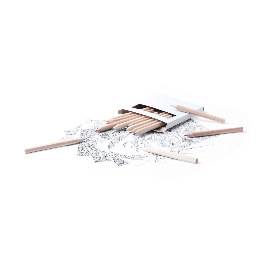 Set de lápices y láminas para colorear con diseños mandala para colorear y relajarse. Incluye 12 lápices de cuerpo hexagonal y 12 láminas con diseños diferentes. Presentado en estuche de cartón con ventana.