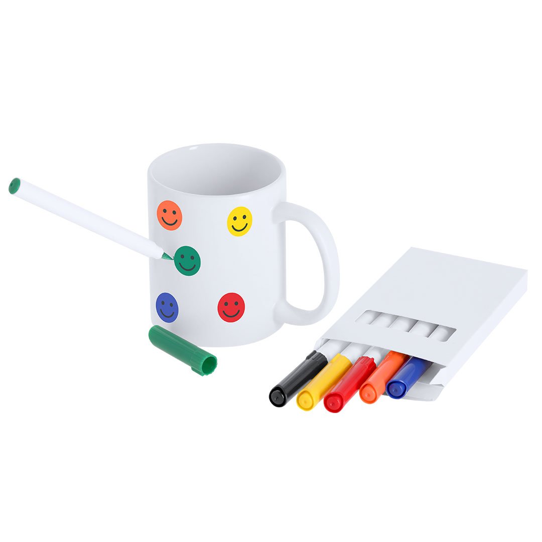 Set de 6 rotuladores en variados colores, diseñados para crear diseños únicos directamente sobre cerámica. Fácil de usar, permite infinitas posibilidades de personalización en casa, fijando los diseños con un horno convencional. Incluye instrucciones de uso detalladas en el reverso de la caja.