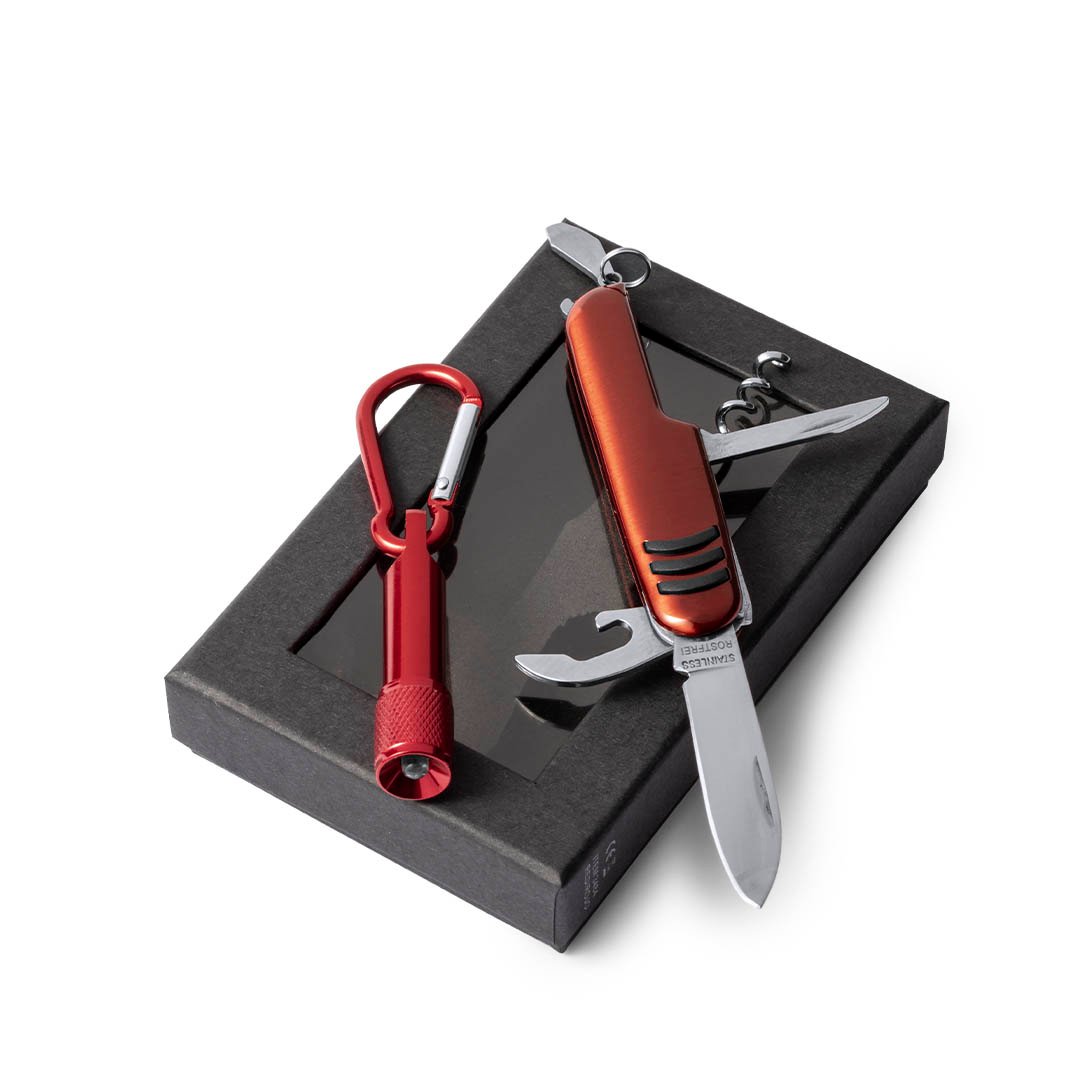 Set de aluminio de navaja multiusos con 7 funciones y linterna mosquetón. En variados colores y presentado en estuche individual con ventana y suave espuma interior troquelada. Pilas de botón incluidas.