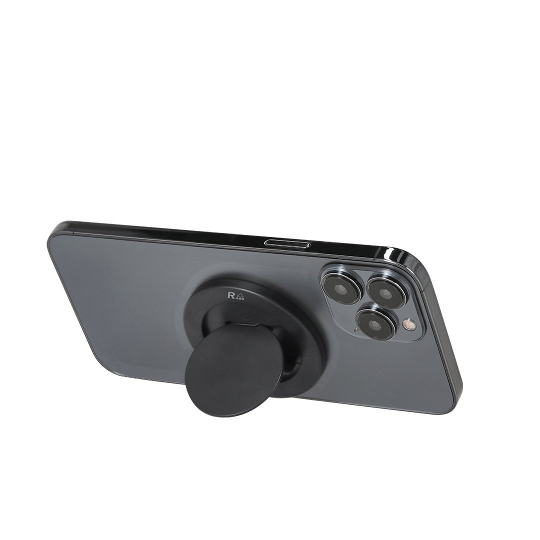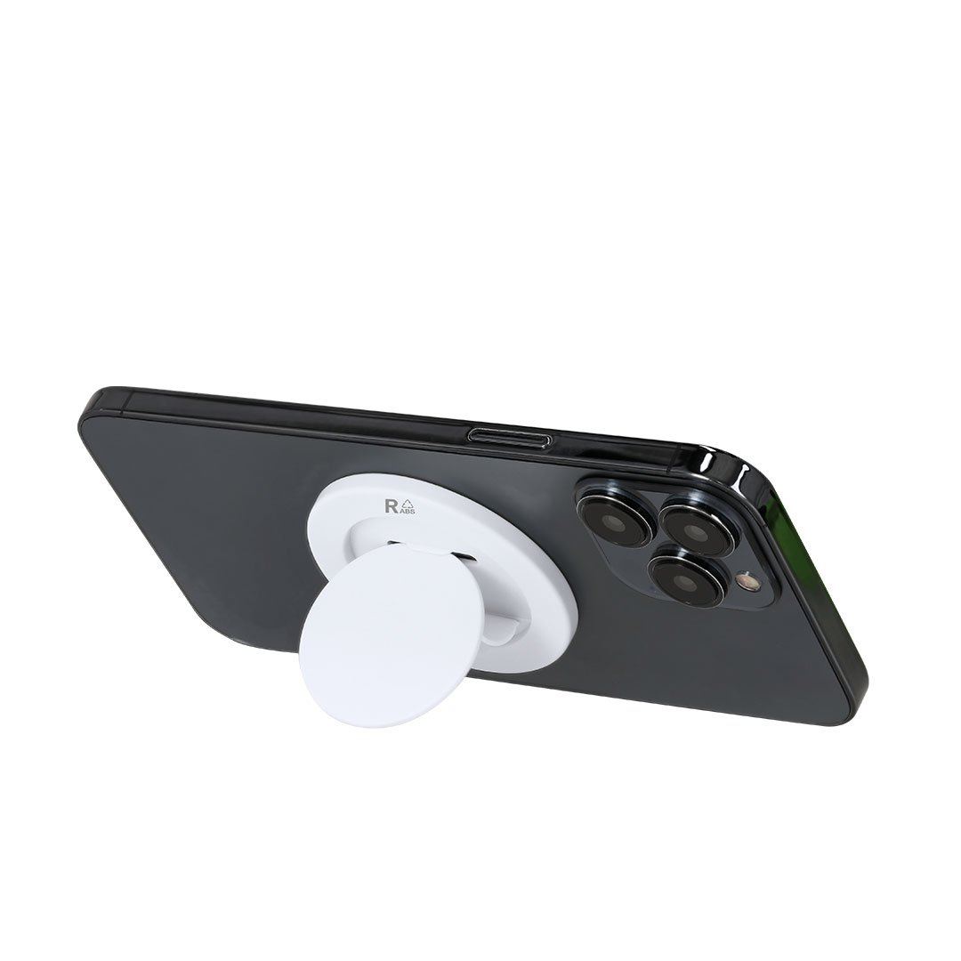 Soporte magnético para smartphone en ABS Reciclado con diseño compacto y plegable. Incluye función doble, soporte retráctil para apoyar teléfono y sujeción segura.