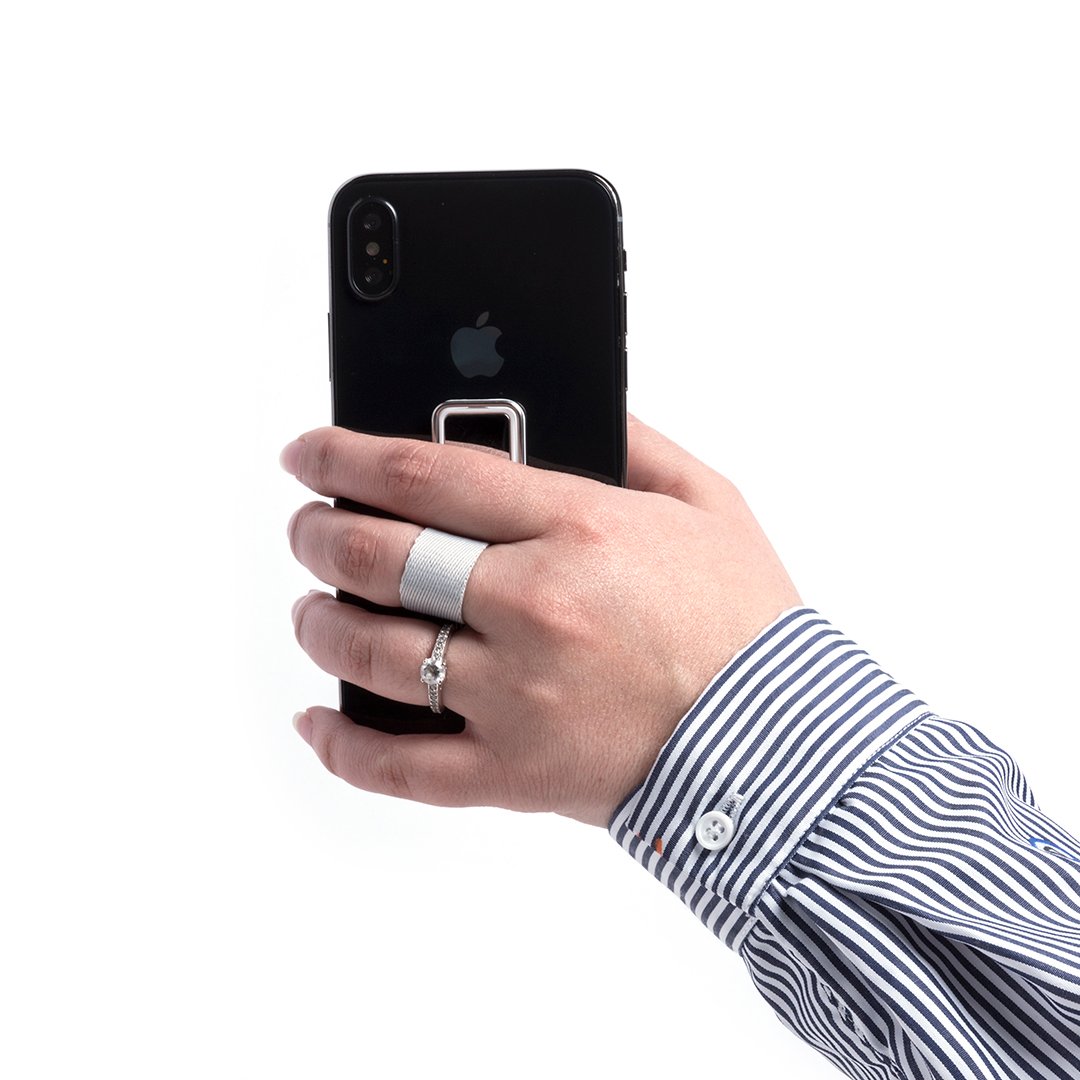Original soporte adhesivo para smartphone con cinta para selfies en resistente poliéster y pastilla central para marcaje. Con soporte metálico y presentado en atractiva bolsita de diseño.
