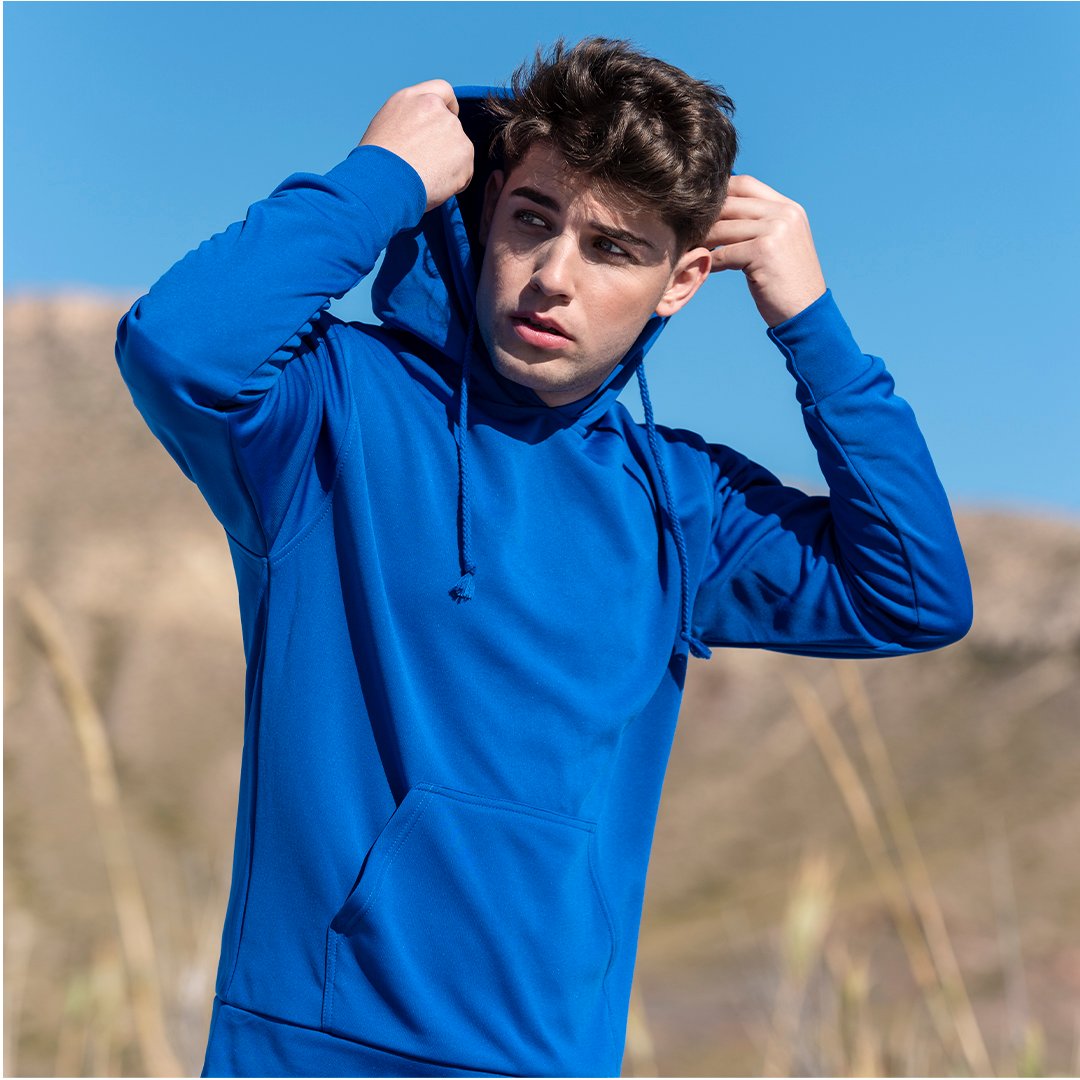 Sudadera técnica para adulto unisex. Con capucha, cintas de ajuste, bolsillo frontal con tapeta y en material 100% poliéster de 265g/m2. Disponible en variada gama de vivos colores. Tallas S, M, L, XL, XXL.