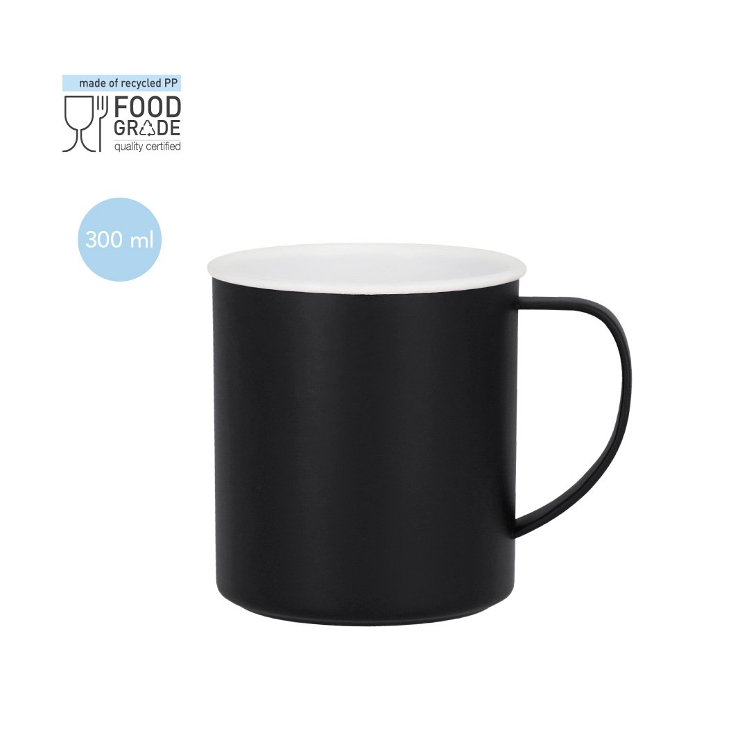 Taza de PP Reciclado con 300 ml de capacidad. Con interior en color blanco y exterior en distintivos colores. Libre de BPA.El PP Reciclado es un plástico reciclado y altamente reciclable, de gran resistencia y apto para multitud de aplicaciones. Con certificación Food Grade, garantizando la seguridad cuando los alimentos entran en contacto con el material usado para fabricar el producto.