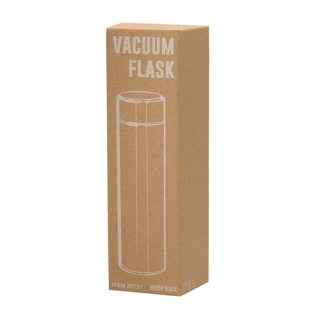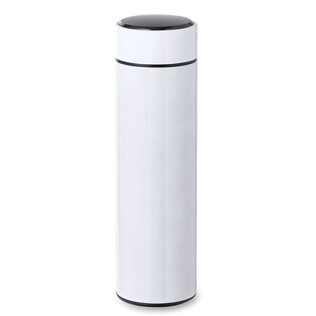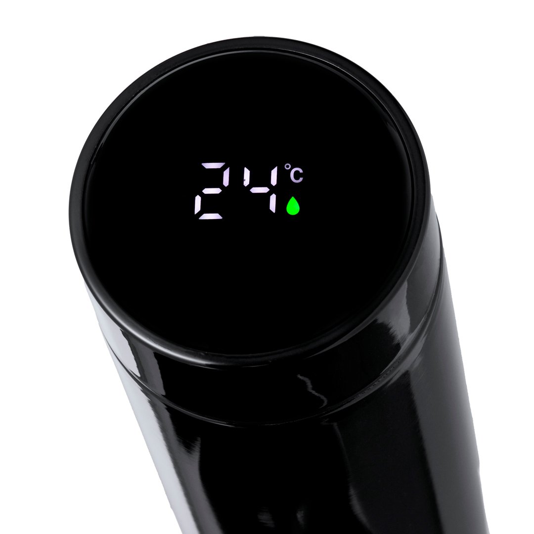 Termo en alta calidad de doble pared y 450 ml de capacidad, con medidor de temperatura táctil integrado en tapón. Fabricado en acero inox, que ofrece una resistencia y durabilidad excepcionales. Tapón en acero inox con infusor integrado y libre de BPA. Alimentación a pilas (de botón incluida), con manual de instrucciones en español e inglés. Disponible en variada gama de colores y presentado en atractiva caja de diseño kraft.