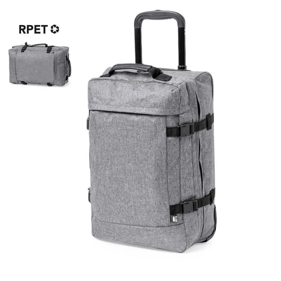 Trolley de línea nature fabricado en resistente 300D RPET. Compartimento principal con cierre de cremallera de doble tirador conforme a los estándares TSA -Administración de la Seguridad en el Transporte-, que permite a las autoridades de aduanas inspeccionar el contenido del equipaje sin tener que forzar o romper el cierre, usando una llave especial a disposición de la autoridad. Interior forrado y con cintas elásticas de sujeción. Exterior con 2 cintas ajustables, cierres de hebilla, bolsillo frontal con cierre de cremallera invisible y 2 asas acolchadas de transporte. Mecanismo extensible metálico en negro, con cómoda asa de transporte y 2 ruedas. Distintivo RPET en etiqueta exterior.