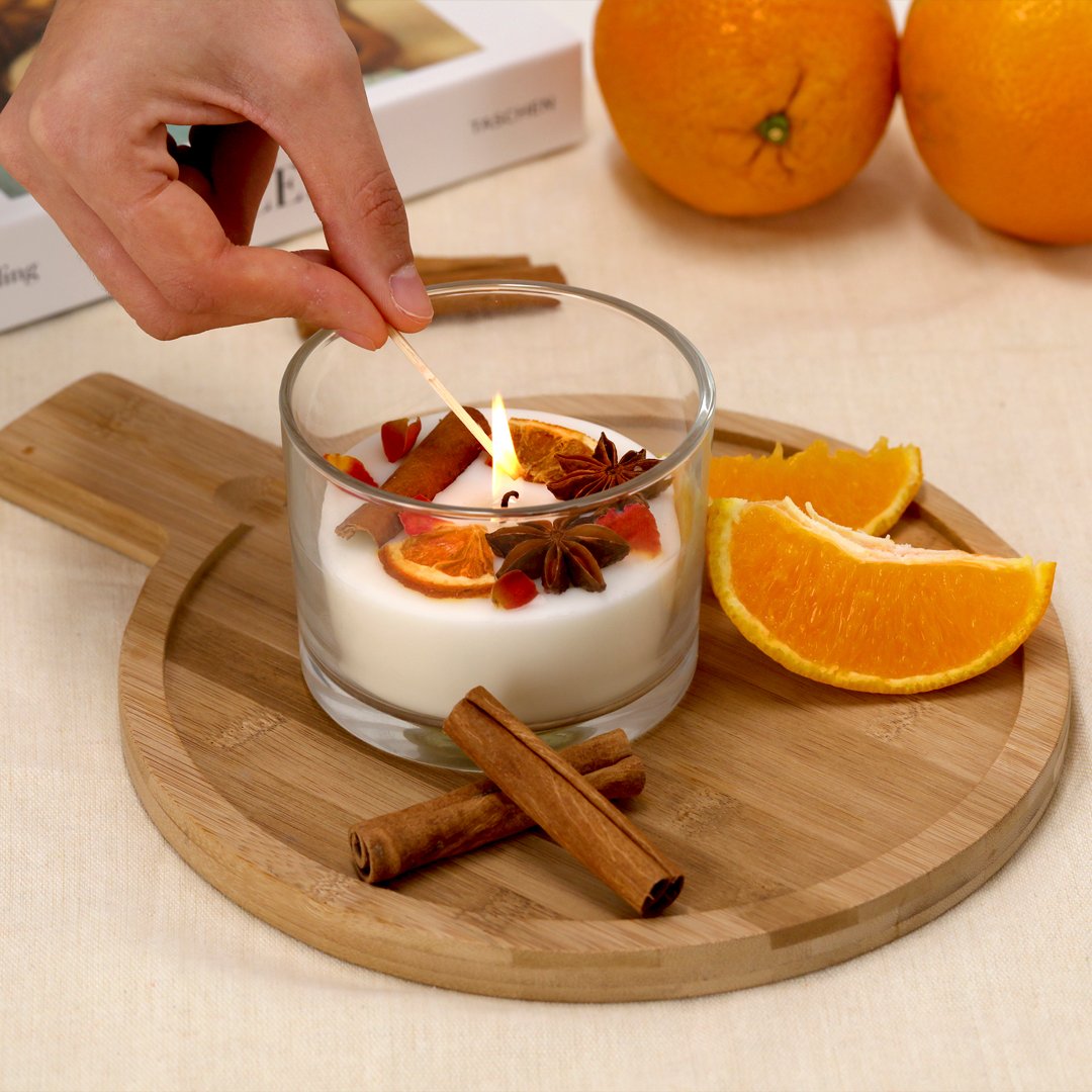 Vela aromática elaborada con cera vegetal y aroma de canela y cítricos. Con pétalos de flor rosa, rama de canela, rodajas de naranja seca y anís estrellado como elementos decorativos en la parte superior.