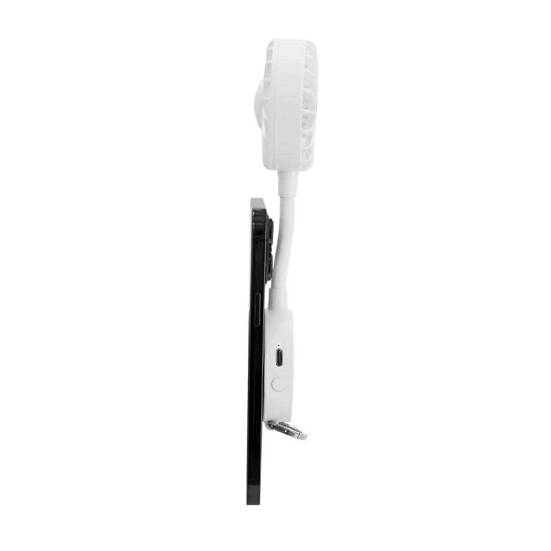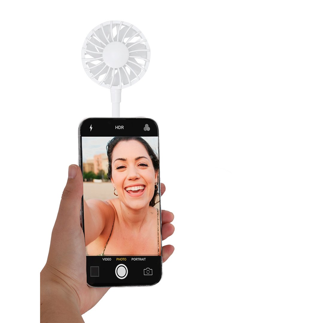 Ventilador multiposición con rotación de 360°, fabricado en ABS de color sólido y equipado con imán magnético para la sujeción con el móvil. Incluye soporte ajustable. En el extremo inferior cuenta con un mosquetón y anilla metálica. Dispone de 3 velocidades regulables mediante botón, e incorpora cable de carga USB A a USB C en el mismo color, junto con una batería de 300 mAh. Diseño compacto, funcional y portátil, ideal para uso personal en exteriores o interiores. Componentes resistentes y ensamblaje magnético para fácil plegado y transporte.